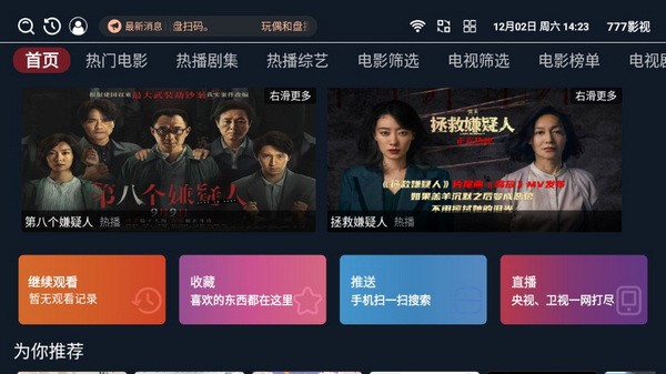777影视是一款手机影视播放软件,支持用户将手机画面投屏到电视上观看,大屏观影体验更佳。它整合了全网热门影视资源,包括各种电视频道和直播APP的内容,用户可以免费追剧和下载。软件界面适配电视大屏幕,操作简单方便。