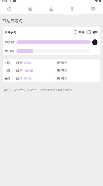 3、平台上面支持各种各样的手势操作设置,比如横屏,竖屏或者底边手势等等。