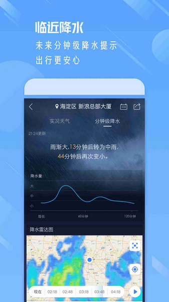 分钟级预报和降水地图--未来降水预报,准确到分钟级别。用户所在街道,每时每刻雨雪变化,尽在掌握;