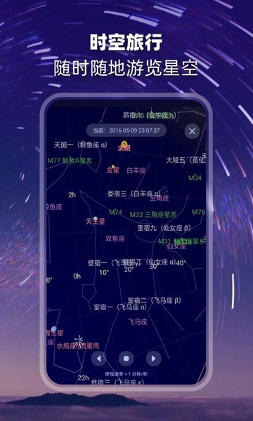 2、您的星空地图当前时间旅行模式,显示您正在访问的日期,底部控件提供了时间开始用于从现在向前(后面)的“播放”天体移动轨迹。点击相应控件,可以调整速度来越快(越慢)地穿越时间