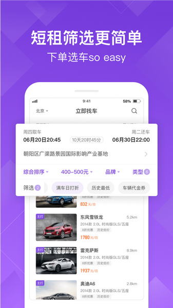 【便捷租车】全流程移动互联网体验,APP一键下单,无需额外流程,全城免费取送车。