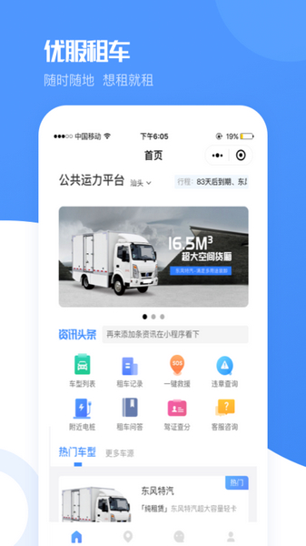 软件中还包含了历史轨迹、一键救援、车辆详情等功能为您服务,为用户提供便捷的出行服务,还提供违章查询,可以快速获得专业的汽车服务,非常方便。优服租车平台旨在成为专业的新能源纯电动汽车领域内物流车和乘用车的第一应用服务商。还能个性化车辆展示,提供新能源产品和服务,满足日常业务需求。