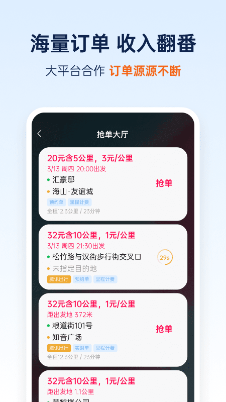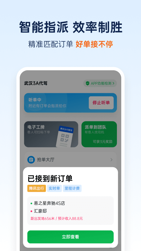 和骏出行app是一款为代驾司机在线接单的出行服务软件。司机用户可以通过这款软件在线接取各类客户下达的订单,在抢单大厅中可以选择合适的订单接取,让司机有更多的客源渠道可以选择。每个订单会将详细的信息呈现出来,例如出发点和目的地、距离、计费标准等,方便司机择优选择。当然也可以由系统自动为司机发配订单。