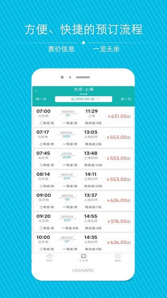火车票、高铁票、机票等票价信息一览无余,给你提供了方便快捷的预订流程;