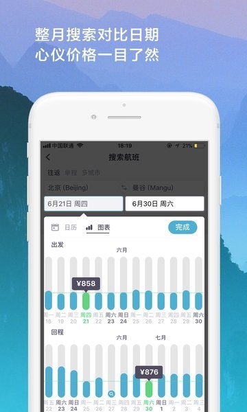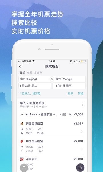 3、天巡提供了灵活的搜索选项。您可以搜索任意地点查找飞往世界各地的机票价格信息,获取旅行灵感。您也可以浏览所选航线整月甚至整年的价格走势,做出最实惠的选择。