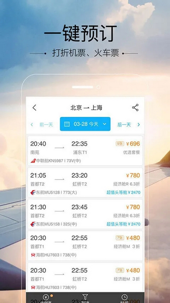 2、一键预订机票、火车票,更有超值头等舱,以经济舱的价格享受头等舱的待遇;