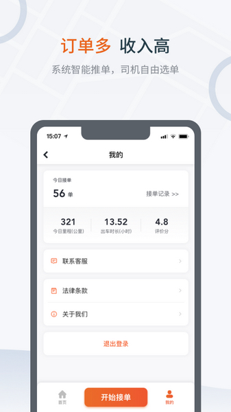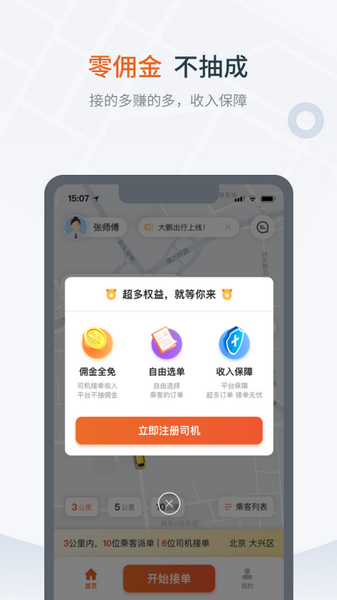 1、订单多,收入高,系统智能推单,司机自由选单。