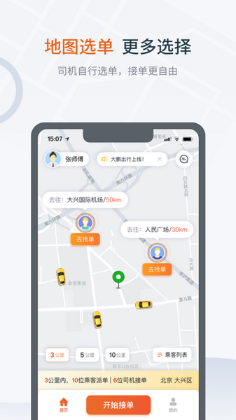 2、地图选单,更多选择,司机自行选单,接单更自由。