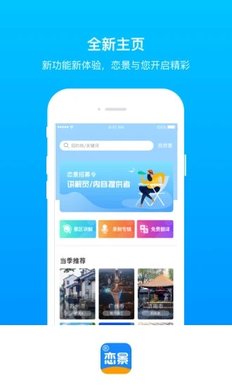 新恋景app提供丰富的旅游资源,为用户提供免费的全球景点讲解,全新景区故事“每天听旅行”专题栏目讲述,景区游览实时定位播讲,沟通交流“急”时翻译。
