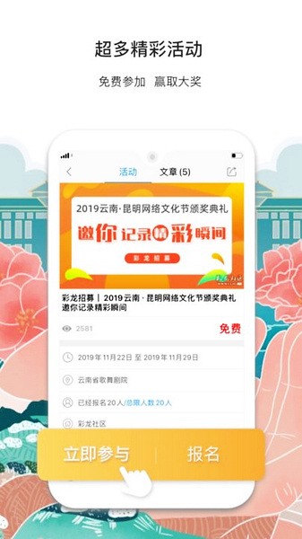 彩龙社区app是一个专为云南省用户打造的本地社区软件,功能丰富,涵盖新闻资讯、吃喝玩乐、旅游攻略等。用户可以快速了解当地动态,参与各种活动,比如英语口语大赛或摄影比赛,还能通过点赞、评论等方式互动交友。注册方便,用手机号就能轻松成为会员,上传作品认证后还能成为大V。界面设计美观,操作便捷,加载速度快,使用体验很好。作为一个喜欢云南旅游的人,我觉得这个app特别适合了解当地文化,尤其是那些关于美食和旅行的内容,简直让人迫不及待想打开看看!