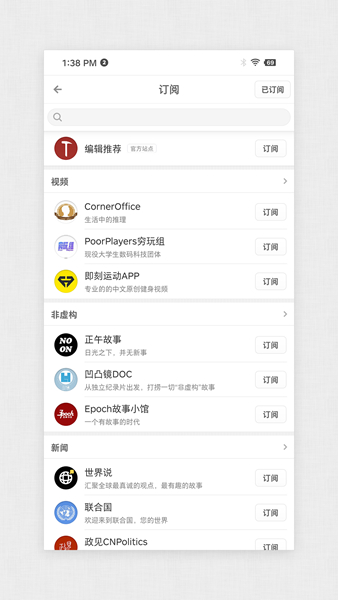 珍新闻是一款非常有意思的新闻App,界面设计简洁明了,操作起来特别方便。它不仅有图文资讯,还有视频新闻,内容涵盖了各种领域,信息量很大。最让我喜欢的是它的“非虚构”频道,这里的报道都很有深度,能让人静下心来思考一些问题。