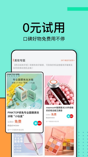 通过西五街app可免费获取高品质美妆、护肤、居家商品,分享自己的试用体验即可申请试用。
