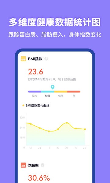 体重、体脂、BMI、……各种重要数据为你长期记录并直观显示你的身体指数所属范围。
