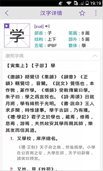 康熙字典手机版是一款专为有汉字研究需求的用户打造的实用工具,用户可以快速查询和了解自己不认识的字词句。作为一部具有深远影响的汉字辞书,康熙字典采用部首分类法,并按照笔画排列单字,软件在其基础上进行了排版,支持部首法、拼音法等在内的多种查询方式,还引用了《康熙字典》原文注释,真正给予用户准确、全面的汉字查询服务。