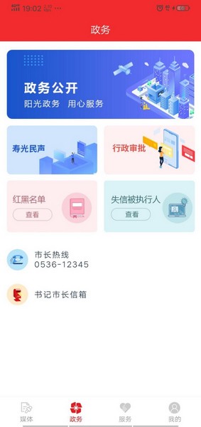 “寿光云”客户端分为 媒体、政务、服务、我的 四大板块。