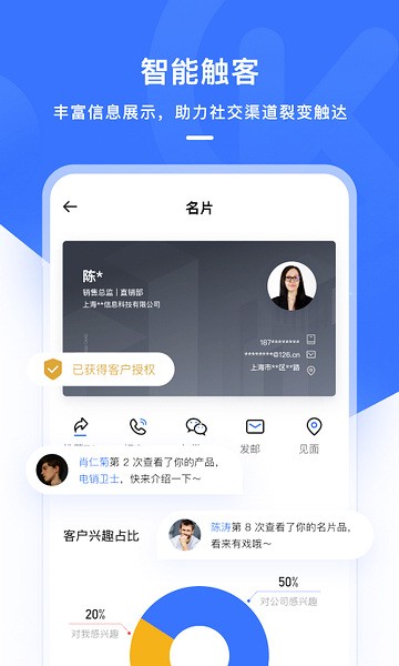 一张名片展示个人与企业全面信息,助力销售以内容传播获取线索;销氪让销售对客户需求了如指掌。
