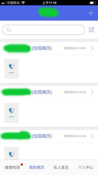 2、打开应用进入我的病历模块,点击添加图标