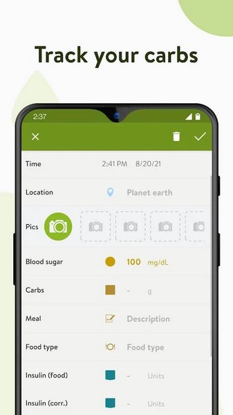 它会自动记录您的数据,此外您还可以收集日常治疗信息,例如膳食、饮食和碳水化合物摄入量。此外,您服用的任何药物、血糖水平和胰岛素水平。