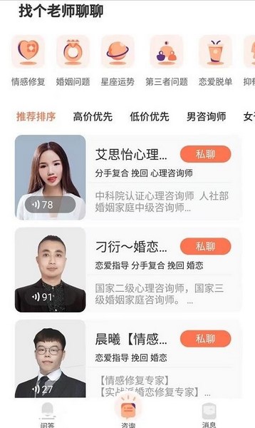这个APP真的很贴心,特别是对于那些在感情中遇到困惑的人来说,简直是救命稻草。分类清晰,功能明确,让人一目了然。不过,在实际使用过程中,可能需要更多时间去适应和找到最适合的咨询方式。毕竟,情感问题复杂多变,有时候并不是一蹴而就的。总的来说,这款APP为用户提供了一个便捷的心理支持平台,值得尝试。