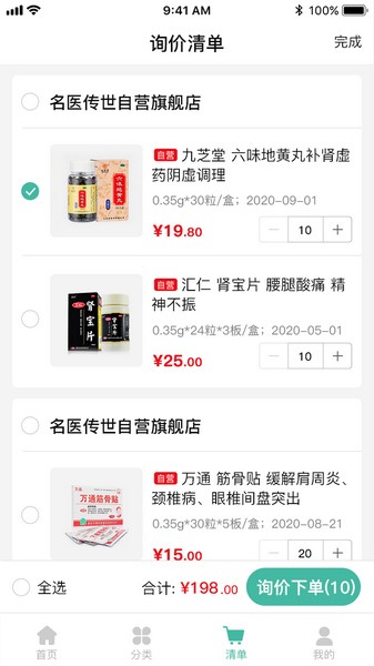 2、可以将各种医药商品加入询价清单中进行一键询价下单操作;
