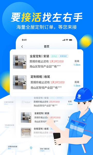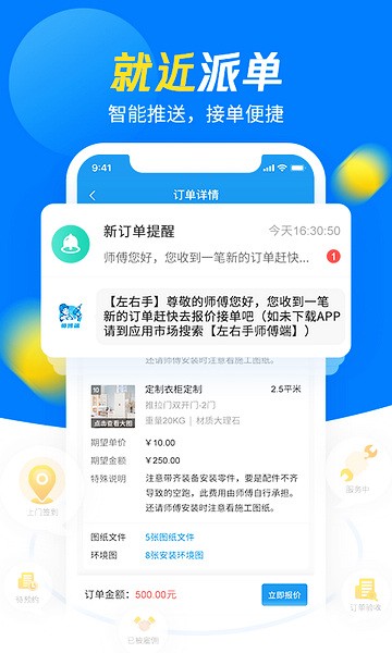 众多周边优质订单实时推送,左右手师傅端确保每位师傅都能匹配高质量订单。