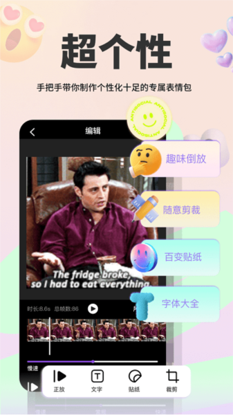 2.便捷的分享功能:app支持分享表情包到社交平台,方便与他人分享。用户可以将制作的表情包分享给其他人。