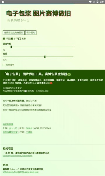 电子包浆生成器app是一款非常不错的图片处理软件,电子包浆其实指的是图片经过多次转手发布后画面慢慢变绿、字体逐渐变黑的情况,通过这款软件大家就可以将各种各样的图片来进行做旧,并且软件内还为大家提供了图片绿化、高效模糊、噪声粒子、像素错位、虚拟水印等超多功能,满足用户们更多的使用需求,调节好做旧的年份以及整体的画质,一张新鲜出炉的旧图便可供保存。