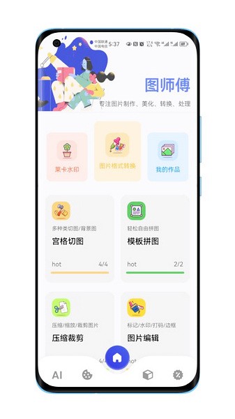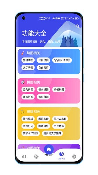 app里的功能非常齐全,比如可以做宫格切图、拼图,还能把图片转PDF或者视频,甚至还有专门的AI橡皮擦和去水印功能,太强大了!特别是它的压缩功能,帮我节省了很多手机空间。最棒的是所有功能都是免费使用的,完全不用花钱就能享受这么好的服务,真的超值!