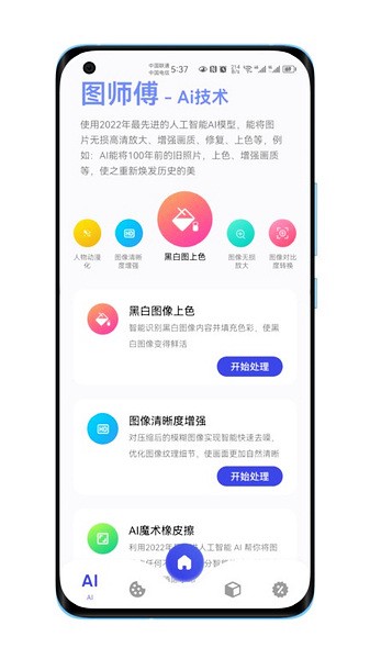 图师傅app是一款非常实用的图片编辑和管理软件,它内置了超多强大的功能,包括极简制图、图片美化、下载、压缩等等,几乎能满足所有图片处理的需求。让我最惊喜的是它的人工智能AI模型,用起来特别方便,能把模糊的照片变清晰,还能给黑白照片上色,真的很厉害!而且操作界面简单直观,新手也能轻松上手。