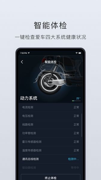 锁车开锁清晰指示,一键寻“牛”; 呼吸灯亮起,钥匙孔灯亮起6、车辆自检测智能化的中控系统,实时收集并反馈车辆状况。当车况出现异常, APP 会做出相应的提醒。
