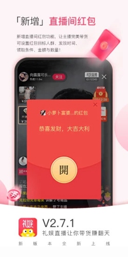 礼娱APP是一款主打直播带货购物赚钱的软件,界面简洁清爽,功能丰富强大,汇集全球海量优质商品,囊括3C数码、美妆个护、清洁洗护、家具厨具、生鲜食品等应有尽有,满足用户的购物需求,同时平台还汇集了众多有颜主播,在线连麦带货,超多好物尖货向你种草,且参与观看直播,更有机会领取大量红包!当然如果对于自己推广能力有信心,那么同样可以在这里成为一名主播,轻松玩赚电商直播!