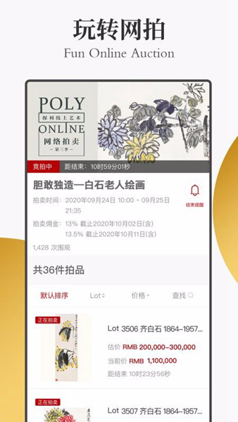 保利拍卖是一款专为中国艺术品爱好者设计的在线拍卖软件,如果你喜欢用国风艺术品装饰家里,这款app绝对值得一试!它专注于中国艺术品拍卖领域,界面简洁又不失专业感。里面汇集了各种各样的宝贝,从古代书画到现代作品,还有古董、珠宝等等,种类超丰富,满足你各种需求。