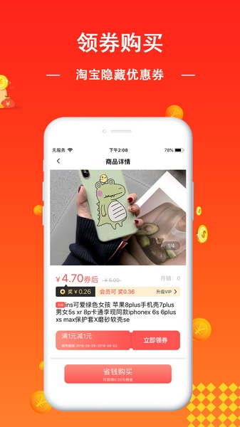 2.通过与淘宝天猫等百万商家合作为用户提供海量优惠券;