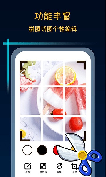 软件里还有一些有趣的编辑功能,比如裁剪、标注和打马赛克,可以让你的照片更有创意。最让我惊喜的是它的拼图模式,九宫格切图和电影台词拼图特别有意思,感觉像在玩一样!如果你喜欢截长图,这个app肯定适合你,因为它能无缝拼接长图,还能保存高清图片。