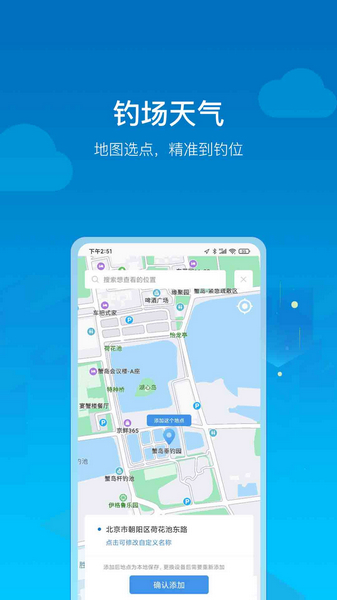 3、准确到钓场的天气预报:直接地图搜钓点,准确了解钓场地理坐标天气状况,为您提供更具参考意义的垂钓指数,还可以自定义钓场名称,实用方便;