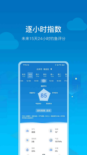 钓鱼天气app官方下载,数据精准,更新及时的手机钓鱼天气预报软件,一键获取未来15天天气,了解气压、风力、温度等信息,在线获取钓场天气,为钓鱼爱好者带来更多便利。