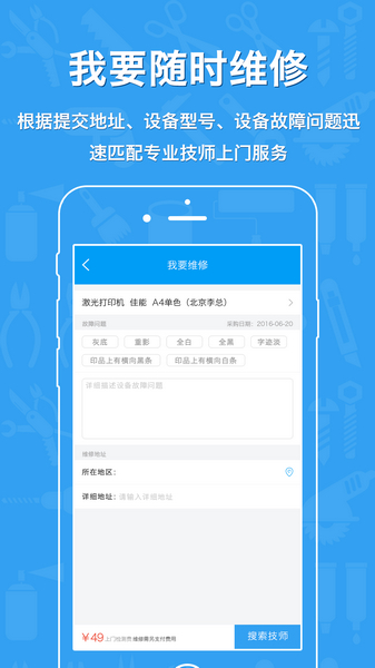 e到修app是一款通过互联网挑选技师上门的维修服务平台,e到修平台有海量的维修技师供你挑选,全新用户体验,轻松一键下单即可快速上门为你服务,统一的收费标准,高度的工作效率,帮你解决任何故障问题,e到修一道为你服务。作为一个移动互联网模式下办公设备上门维修安装租赁服务平台,e到修帮助用户解决生活工作中出现的各种办公设备(打印机、复印机、投影机等)安装、维修、租赁以及耗材更换问题。5分钟内响应,2小时内上门服务。