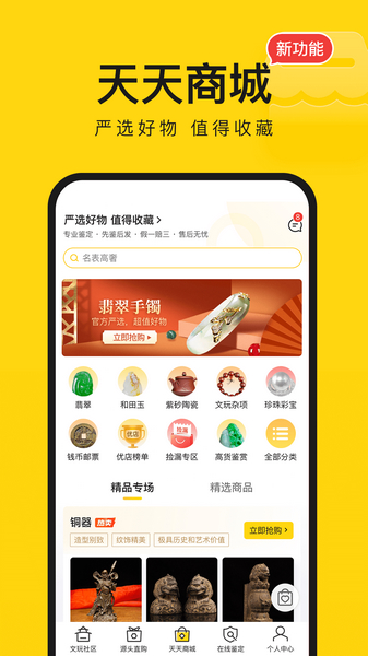 天天鉴宝致力于为大家提供珠宝玉石、文玩把件等物品交流社区,集鉴定师、商家、爱好者与发烧友共聚一堂。让你的玉石文玩等宝贝与大咖无隔阂交流和展示。打造鉴定新概念,与专业鉴定师在线免费面对面交流鉴定,全方位数字化的鉴定评估,像手机跑分一样直观。我们还有源头直供的直播卖场。