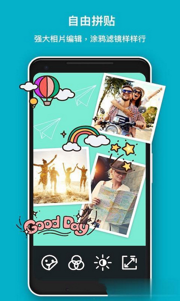 添加贴纸,文字,背景,涂鸦,寄宿生和马赛克,或调整照片的亮度,对比度,饱和度和布局!
