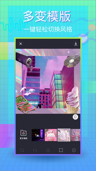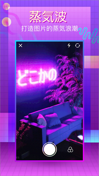 VaporCam蒸汽波相机,一款超现实图片编辑器,致力打造酷酷的蒸汽浪潮。坐上挂满霓虹灯的时光机,带你穿梭到八、九十年代在蒸汽弥漫的梦中停滞、沉浸用已脱离肉体的真实感官,在怀旧中感受现代在欲望、情感与自由之中,感受蒸気波的意乱情迷。拍出的相片仿佛穿越回了八九十年代,让人着迷。