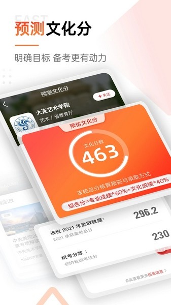 根据考生统考专业成绩结合过往大数据,快速预估所需文化分,让考生备考更有目标和动力。