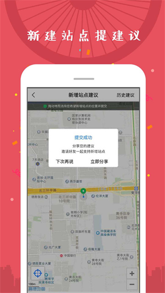 点击地图页面的“锤子”图标并拖动地图即可提交您想要新增站点的位置,分享给好友还能得到更多的支持。