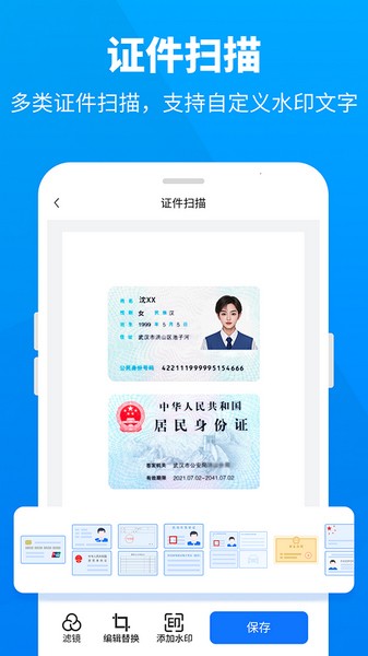 提供了证件扫描功能,支持多类型的证件扫描并生成高清电子版。