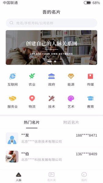 1、人脉市场,把用户名片划分为互联网、农业等行业人才,便于你查找;