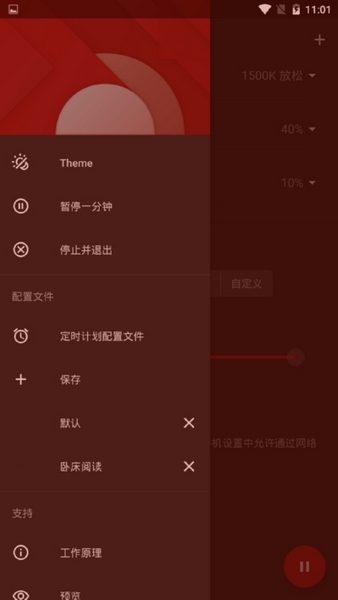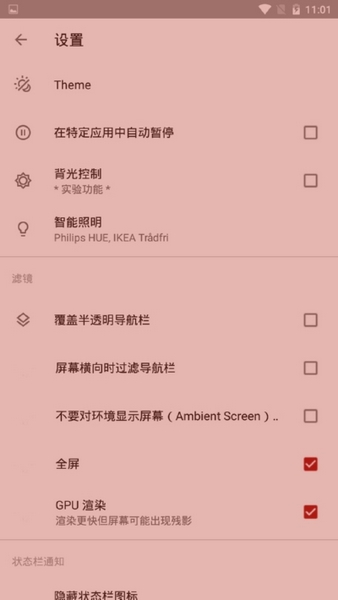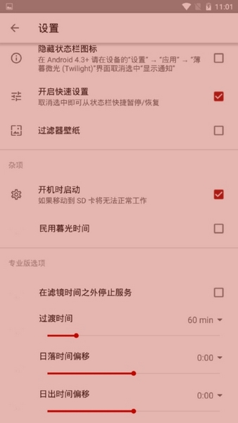 最让我满意的是它已经解锁了Pro版的所有功能,不用额外买密钥就能用。软件还能根据日出日落时间自动调节滤镜强度,晚上屏幕会变成红色调,看起来特别柔和。而且它的设置选项很多,可以自己调整色温、亮度、暗光模式等等。