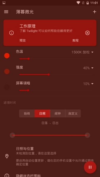 薄暮微光(Twilight) 应用使您的设备屏幕适应一天中的时间推移。它会在日落后过滤掉您手机或平板电脑屏幕上的蓝色光谱,并以柔和而悦目的红色滤镜来保护您的眼睛。滤镜的强度会根据您所在地日出与日落时间 的日照周期而 平滑地调节