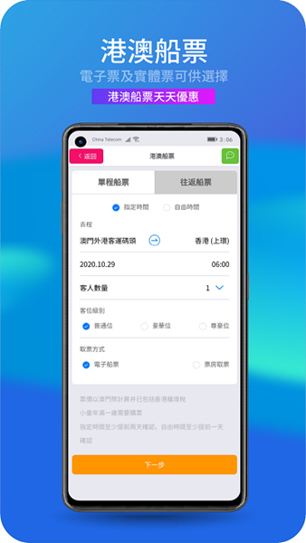 2、提供电子船票及实体船票选择,更方便您港澳出行;