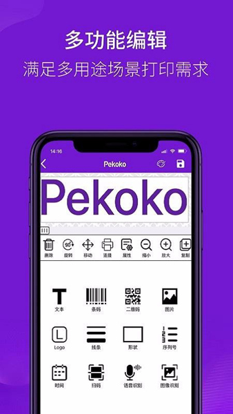 可自定义设计条形码、二维码、Logo、图片、线条、形状、序列号、时间,同时提供丰富色彩选择,满足多用途场景打印需求。