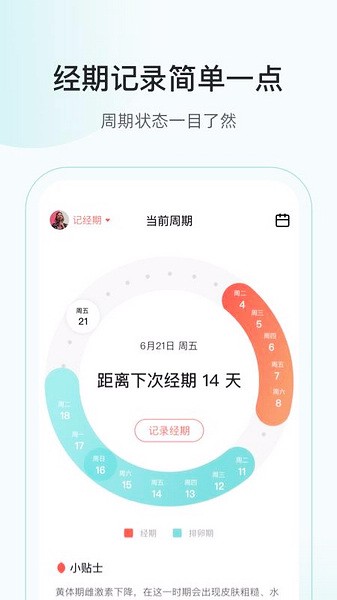 界面设计也很棒,用圆圈图展示周期,颜色区分特别清楚,排卵期什么的都能一目了然。而且还有科学的小贴士,看起来很有专业性。总的来说,“美期”不仅是个记录工具,更像是个综合的健康管理平台,对于像我这样喜欢折腾各种健康数据的人来说,真的会爱上这个app!