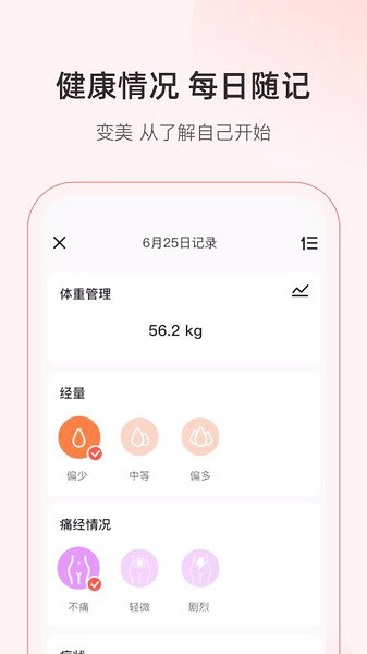 4、美期拥有多种不同的管理记录栏目内容,其中有体重管理、经量、痛经情况以及病症等内容;